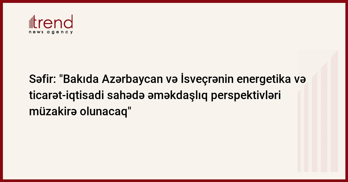 Azərbaycan, Bakı, / Trend müxbir S.Ağayeva/ Bakıda Azərbaycan və İsveçrənin energetika və ticarət-iqtisadi sahədə əməkdaşlığının inkişafı noyabrın 14-15-də Bakıda iki ölkənin hökumət nümayəndələri tərəfindən müzakirə olunacaq. Çərşənbə günü Azərbaycanın İsverədəki səfiri Elçin Əmirbəyovun verdiyi məlumata görə, danışıqlar Azərbaycan-İsveçrə hökumətlərarası iqtisadi əməkdaşlıq komissiyasının növbəti iclası zamanı aparılacaq.