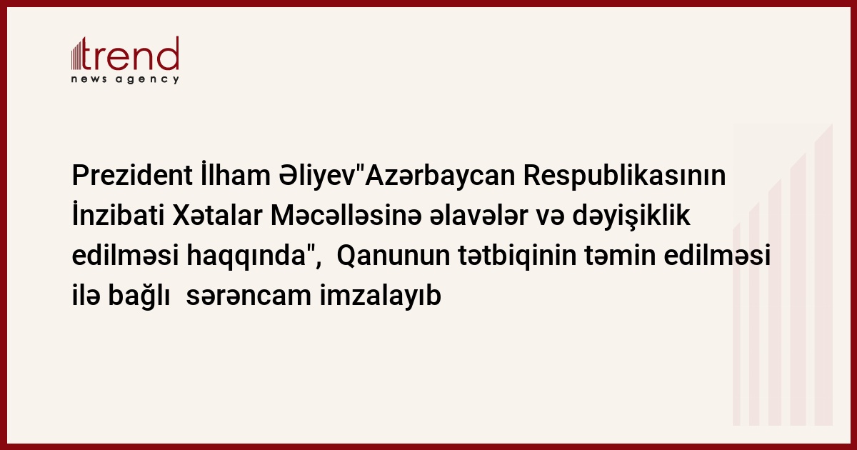 Azərbaycan, Bakı/ Trend , Prezident İlham Əliyev "Azərbaycan Respublikasının İnzibati Xətalar Məcəlləsinə əlavələr və dəyişiklik edilməsi haqqında" Azərbaycan Respublikasının 2007-ci il 19 oktyabr tarixli 455-IIIQD nömrəli Qanununun qüvvəyə minməsi ilə əlaqədar, həmin Qanunun tətbiq edilməsinin təmin edilməsi haqqında sərəncam imzalayıb.Sərəncamdan irəli gələn vəzifələrin həll olunması Nazirlər Kabinetinə həvalə olunub.
