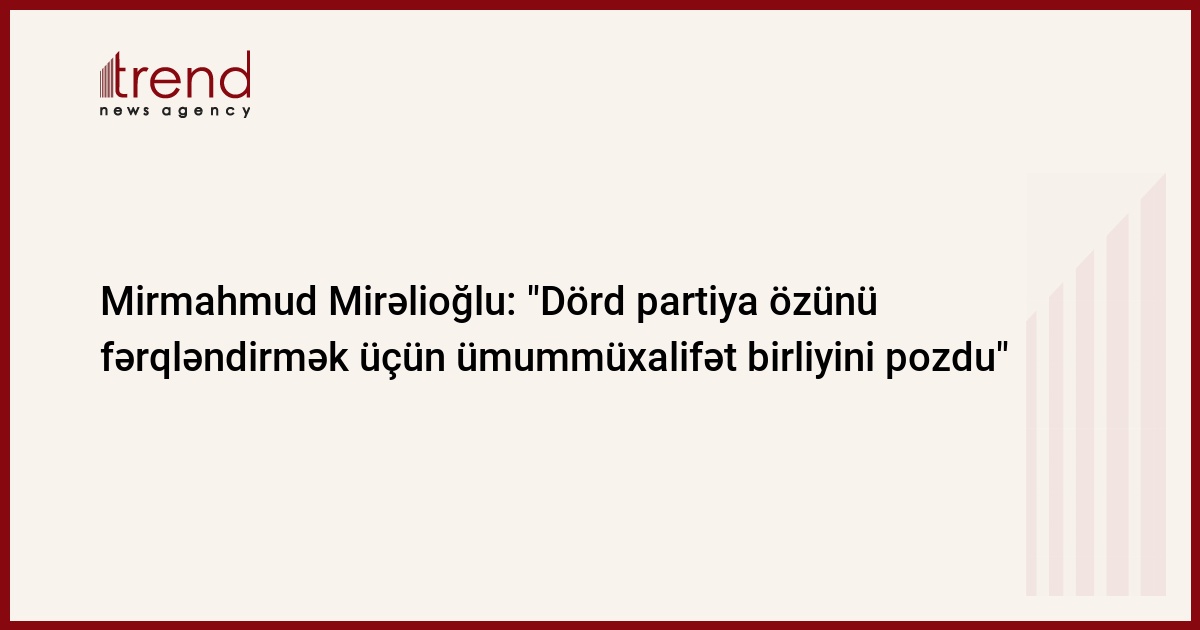 Azərbaycan, Bakı / Trend müxbir S.İlhamqızı/ Dörd müxalifət partiyası özünü fərqləndirmək üçün ümummüxalifət birliyini pozdu. Bu fikirləri bazar ertəsi Trend ə açıqlamasında Klassik Xalq Cəbhəsi Partiyasının sədri Mirmahmud Mirəlioğlu bildirib.