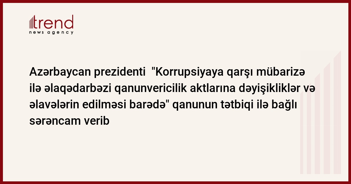 Azərbaycan, Bakı / Trend / Prezident İlham Əliyev "Korrupsiyaya qarşı mübarizə ilə əlaqədar Azərbaycan Respublikasının bəzi qanunvericilik aktlarına dəyişikliklər və əlavələrin edilməsi barədə" Azərbaycan Respublikasının 2007-ci il 23 oktyabr tarixli qanununun qüvvəyə minməsi ilə əlaqədar həmin qanunun tətbiq edilməsinıtəmin etmək məqsədi ilə sərəncam verib.