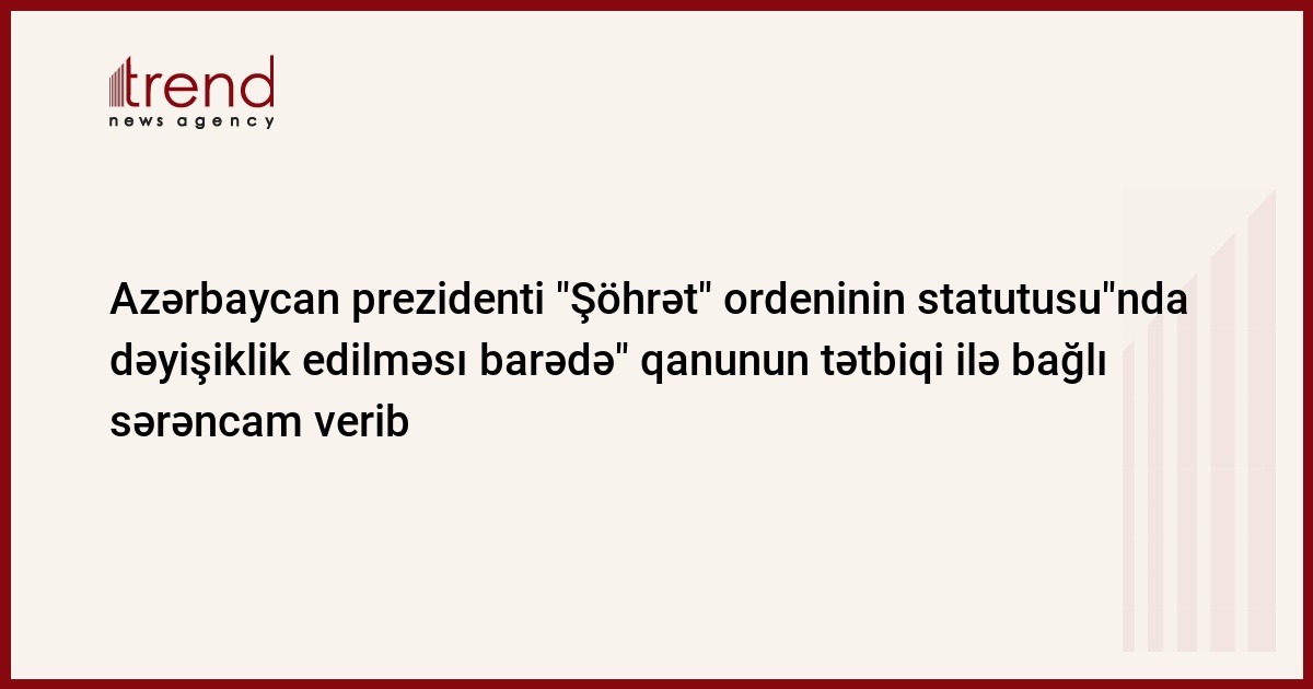 Azərbaycan, Bakı / Trend / Prezident İlham Əliyev "Azərbaycan Respublikasının 1993-cü il 6 dekabr tarixli 757 saylı qanunu ilə təsdiq edilmiş "Azərbaycan Respublikasının "Şöhrət" ordeninin statutusu"nda dəyişiklik edilməsı barədə" Azərbaycan Respublikasının 2007-ci il 19 oktyabr tarixli qanununun qüvvəyə minməsi ilə əlaqədar həmin qanunun tətbiq edilməsini təmin etmək məqsəd ilə sərəncam verib.