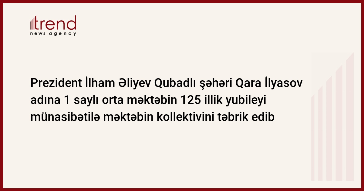 Azərbaycan, Bak/ Trend , Prezident İlham Əliyev Qubadlı şəhəri Qara İlyasov adına 1 saylı orta məktəbin 125 illik yubileyi münasibətilə məktəbin kollektivini təbrik edib. Regionda təhsil şəbəkəsinin inkişaf etdirilməsində və gənc nəslin dünyəvi elmləri mənimsəməsində bu qocaman tədris müəssisəsinin xüsusi xidmətləri olduğunu qeyd edən ölkəmizin başçısı, məktəbin məzunları arasında Azərbaycanın ictimai-siyasi, mədəni-elmi həyatında yaxından iştirak etmiş ictimai xadimlər, yazıçılar və alimlərin olduğunu vurğulayb. . Ermənistan tərəfindən işğala məruz qalmş Qubadlınn digər təhsil və mədəniyyət ocaqları kimi, Qara İlyasov adna 1 saylı orta məktəb bu gün Sumqayıt şəhərində məskunlaşsa da, uzun illər boy qazandığı pedaqoji nailiyyətlərini davam etdirir, vətənpərvər ruhlu övladlar yetişdirilməsində qüvvə və bacarığını əsirgəmir. Prezident Əliyev ümidvar olduğunu bildirib ki, ölkəmizin maarifçilik ənənələrinə sadiq qalan məktəb, təhsil sistemimizin inkişaf etdirilməsi işinə bundan sonra da öz töhfəsini verəcəkdir.