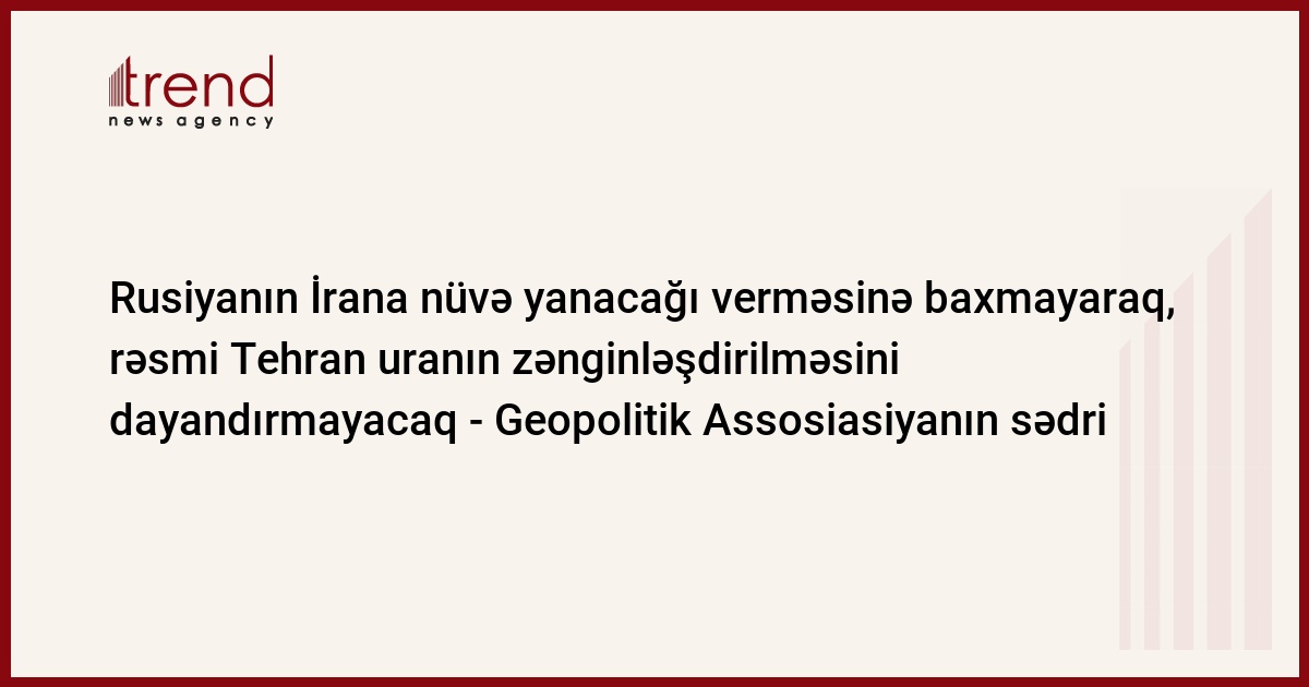 Azərbaycan, Bakı / "Trend müxbir D.Xatınoğlu/ Rusiyanın İrana nüvə yanacağı verməsinə baxmayaraq, rəsmi Tehran uranı zənginləşdirmək planını dayandırmayacaq. "Rusiyanın İrana verdiyi vədləri dəfələrlə pozmasını nəzərə almaqla İranın uranın zənginləşdirilməsini dayandıracağını gözləmək absurddur" İran Geopolitik Assosiasiyanın sədri və Tehran Universitetinin müəllimi Pr.İzzətullah İzzəti bildirib.