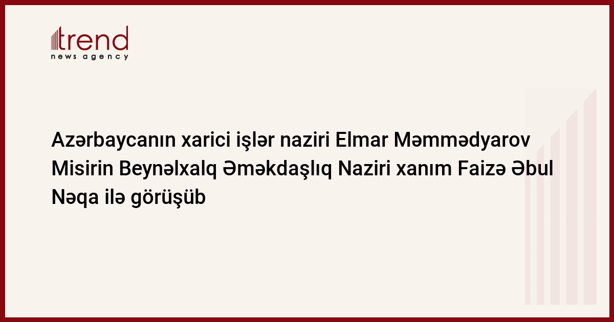 Azərbaycan, Bakı / Trend / Azərbaycanın XİN mətbuat xidmətindən Trend ə bildiriblər ki, cümə axşamı xarici işlər naziri Elmar Məmmədyarov Misirin Beynəlxalq Əməkdaşlıq Naziri xanım Faizə Əbul Nəqa ilə görüşüb.Məmmədyarov Misirlə əməkdaşlığa ölkəmizdə böyük önəm verildiyini vurğulayıb, iki dövlət arasında siyasi əməkdaşlığı, beynəlxalq təşkilatlar daxilində qarşılıqlı dəstəyi yüksək qiymətləndirib. Tərəflər Azərbaycanla Misir arasında mədəni və humanitar sahədə əməkdaşlığın iqtisadi sahədə də gücləndirilməsi, xüsusilə də, biznes mühitinin yaxşılaşdırılması, investisiyanın təşviqi, səhiyyə, təhsil, informasiya texnologiyaları, nəqliyyat sahəsində əlaqələrin inkişafının vacibliyini qeyd ediblər.