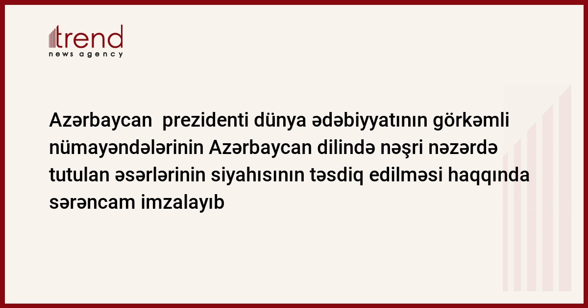 Azərbaycan, Bakı/ " Trend"/ Prezident İlham Əliyev dünya ədəbiyyatının görkəmli nümayəndələrinin əsərlərindən ibarət 150 cildlik "Dünya ədəbiyyatı kitabxanası"na daxil olunmuş əsərlərin siyahısının təsdiq edilməsilə bağlı sərəncam imzalayıb. Sərəncama əsasən, Azərbaycan Milli Elmlər Akademiyası 150 cildliyə daxil edilən əsərlərin tərcüməsi, tərtibatı və çapa hazırlanması barədə təkliflərini bir ay müddətində Azərbaycan Respublikası Prezidentinin İcra Aparatına təqdim etməlidir.