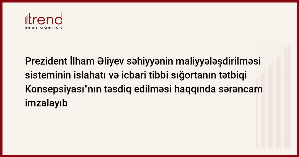 | Azərbaycan, Bakı,10 yanvar/ / Prezident İlham Əliyev"Azərbaycan Respublikasında səhiyyənin maliyyələşdirilməsi sisteminin islahatı və icbari tibbi sığortanın tətbiqi Konsepsiyası"nın təsdiq edilməsi haqqında sərəncam imzalayıb.Sərəncamda deyilir ki, səhiyyə sisteminin maliyyələşdirilməsi prinsipləri üzrə köklü islahatlar həyata keçirilmədən, əhaliyə göstərilən tibbi xidmətlərin keyfiyyətinin arzu olunan səviyyəyə çatdırılması mümkün deyil.Odur ki, ölkədə səhiyyə sisteminin maliyyələşdirilməsinin yeni iqtisadi əsaslarını yaratmaq, bu sahənin idarə olunmasını təkmilləşdirmək, əhaliyə göstərilən tibbi xidmətlərin keyfiyyətini daha da yaxşılaşdırmaq və icbarı tibbi sığortanın tətbiqinə başlamaq məqsədi ilə,səhiyyənin maliyyələşdirilməsi sisteminin islahatı və icbari tibbi sığortanın tətbiqi Konsepsiyası təsdiq olunmalıdır. Nazirlər Kabinetinə iki ay müddətində 2008-2012-ci illəri əhatə edən Tədbirlər Planı hazırlamaq tapşırılıb.Sərəncam imzalandığı gündən qüvvədədir., | ||