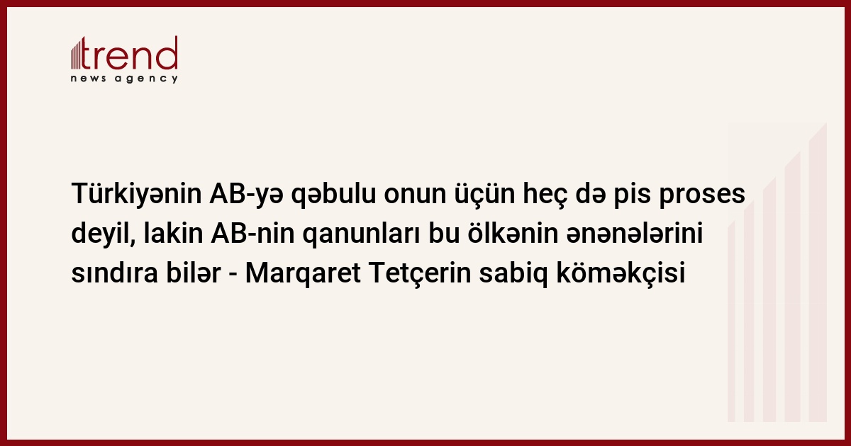 Azərbaycan, Bakı, 29 yanvar / Trend müxbir K.Ramazanova, F.Rzayev/ Türkiyənin Avropa Birliyinə (AB) qəbulu onun üçün heç də pis proses deyil, lakin AB-nin qanunları bu ölkənin ənənələrini sındıra bilər. Bu fikri Böyük Britaniyanın keçmiş baş naziri Marqaret Tetçerin sabiq köməkçisi Normann Stoun ifadə edib.
