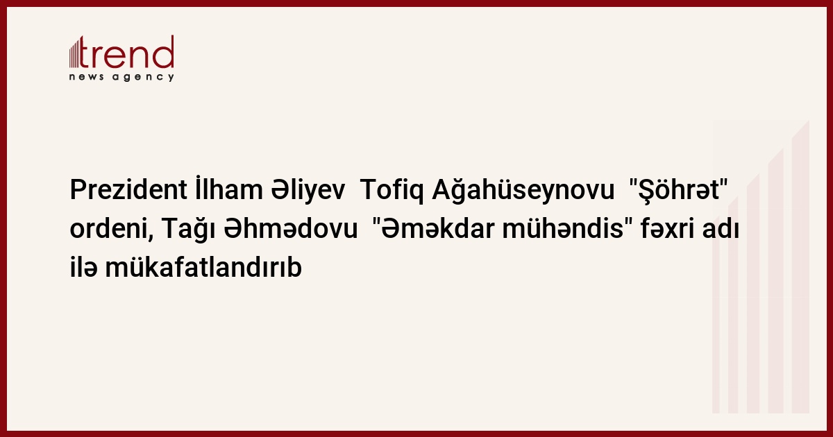 Prezidentin digər sərəncamı əsasında Tağı Əhmədova, ölkənin nəqliyyət infrastrukturunun ikişafında xidmətlərinə görə Əməkdar mühəndis fəxri adı verilib.