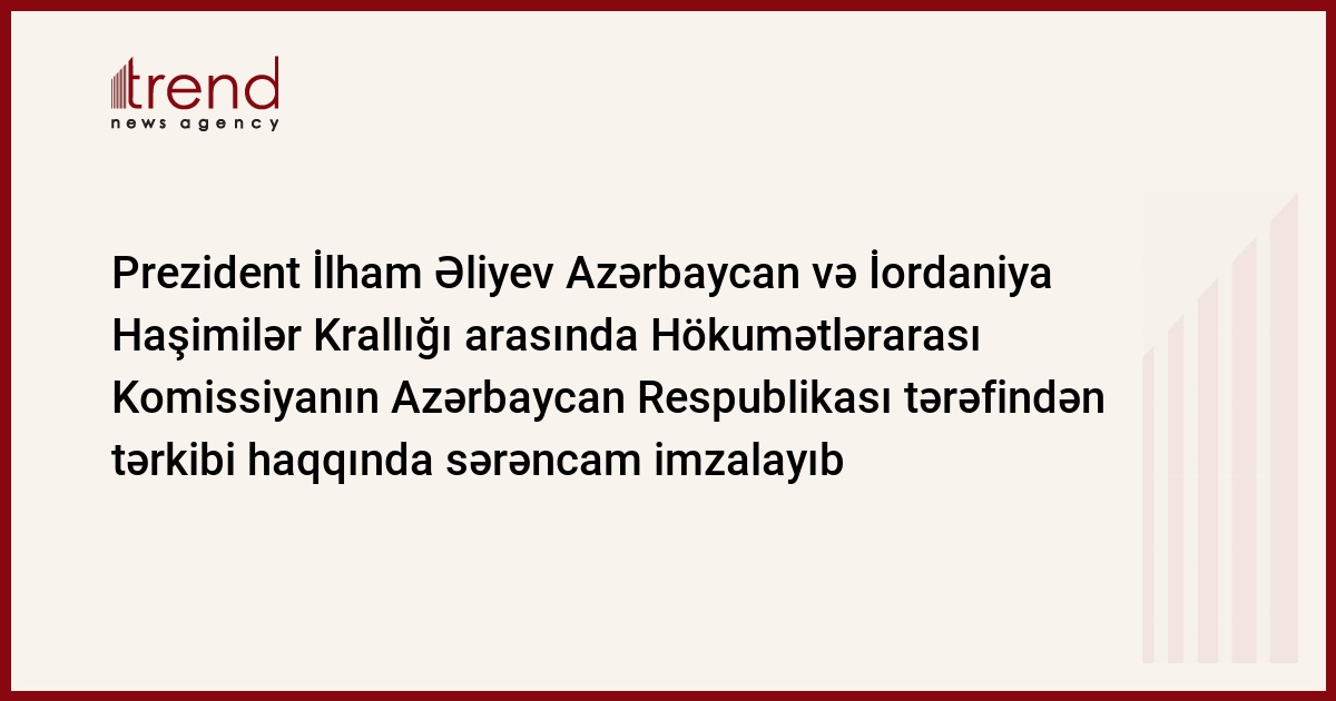 | Azərbaycan Respublikası Hökuməti və İordaniya Haşimilər Krallığı Hökuməti arasında Ticarət, İqtisadi və Texniki Əməkdaşlıq üzrə Hökumətlərarası Komissiyanın Azərbaycan Respublikası tərəfindən tərkibi haqqında sərəncam imzalayıb.Komissiyanın həmsədri iqtisadi inkişaf naziri Heydər Babayevdir. Komissiya üzvlərinə Azərbaycanın xarici işlər, maliyyə,sənaye və energetika,nəqliyyat,kənd təsərrüfatı,mədəniyyət və turizm,təhsil,səhiyyə, rabitə və informasiyanazirlərinin müavinləri,,gömrük komtəsi,Milli bankın idarə şeyətisədrlərinin müavinləri daxildir. Azərbaycanın Haşimilər krallığında fövqəladə və səlahiyyətli səfiri Elman Araslı da hökumətlərarası komissiyanın üzvüdür.Sərəncamda deyilir Ki, bu tərkib iki ölkə arasında ticarət, iqtisadi və texniki əməkdaşlıqəlaqələrinin tənzimlənməsi və daha da genişləndirilməsi istiqamətində müvafiq tədbirləri həyata keçirəcək.2. Bu Sərəncamın 1-ci bəndində göstərilən Komissiyanın AzərbaycanRespublikası tərəfindən tərkibinə tapşırılsın ki, Azərbaycan Respublikası vəİordaniya Haşimilər Krallığı arasında 3. Bu Sərəncam imzalandığı gündən qüvvəyə minir.İlham Əliyev,Azərbaycan Respublikasının Prezidenti.Bakı şəhəri, 7 fevral 2008-ci il. | ||