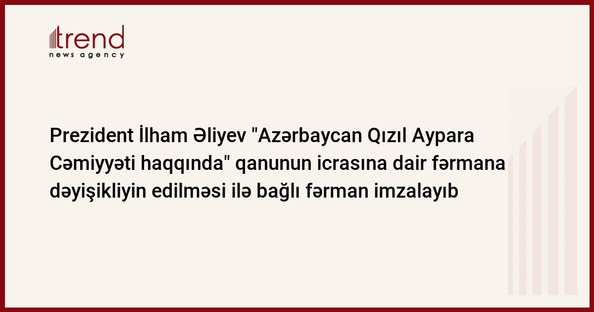 Azərbaycan prezidenti İlham Əliyev "Azərbaycan Qızıl Aypara Cəmiyyəti haqqında" qanunun icrasına dair 2007-ci il mayın 22-də verilmiş fərmana dəyişikliyin edilməsi ilə bağlı fərman imzalayıb.