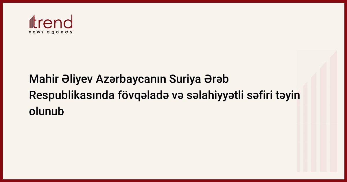 Azərbaycan, Bakı,12 fevral / Trend /Prezident İlham Əliyevin sərəncamı ilə Mahir Əliyev Azərbaycanın Suriya Ərəb Respublikasında fövqəladə və səlahiyyətli səfiri təyin olunub.Prezidentin başqa bir sərəncamına əsasən, Mahir Əliyevə fövqəladə və səlahiyyətli səfir diplomatik rütbəsi verilib.