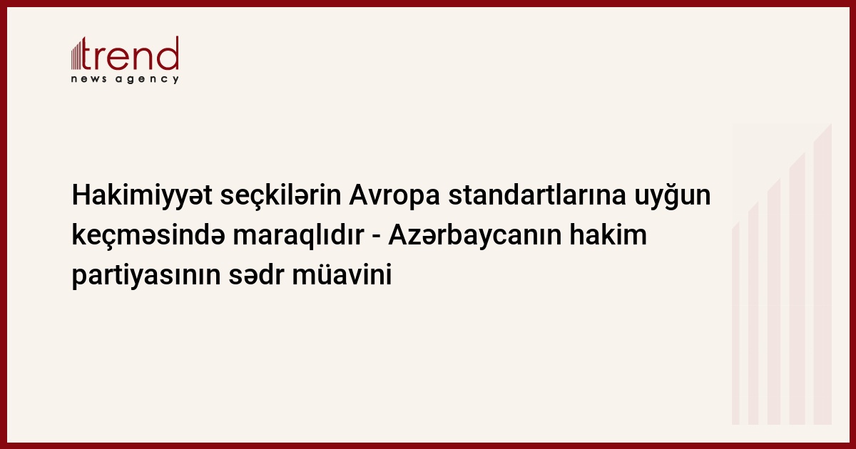 Azərbaycan, Bakı, 14 fevral / Trend , müxbir Q.Cəbiyev/ Azərbaycanın hakim Yeni Azərbaycan Partiyası (YAP) bəyan edib ki, ölkədə prezident seçkiləri Avropa standartları və prinsiplərinə uyğun formada keçiriləcək. "Hakimiyyət seçkilərin Avropa standartları və prinsiplərinə uyğun keçməsində maraqlıdır" cümə axşamı İsveçrə Konfederasiyasının Azərbaycandakı səfiri Alan Guyidetti qəbul edən YAP-ın sədr müavini və icra katibi Əli Əhmədov bildirib.