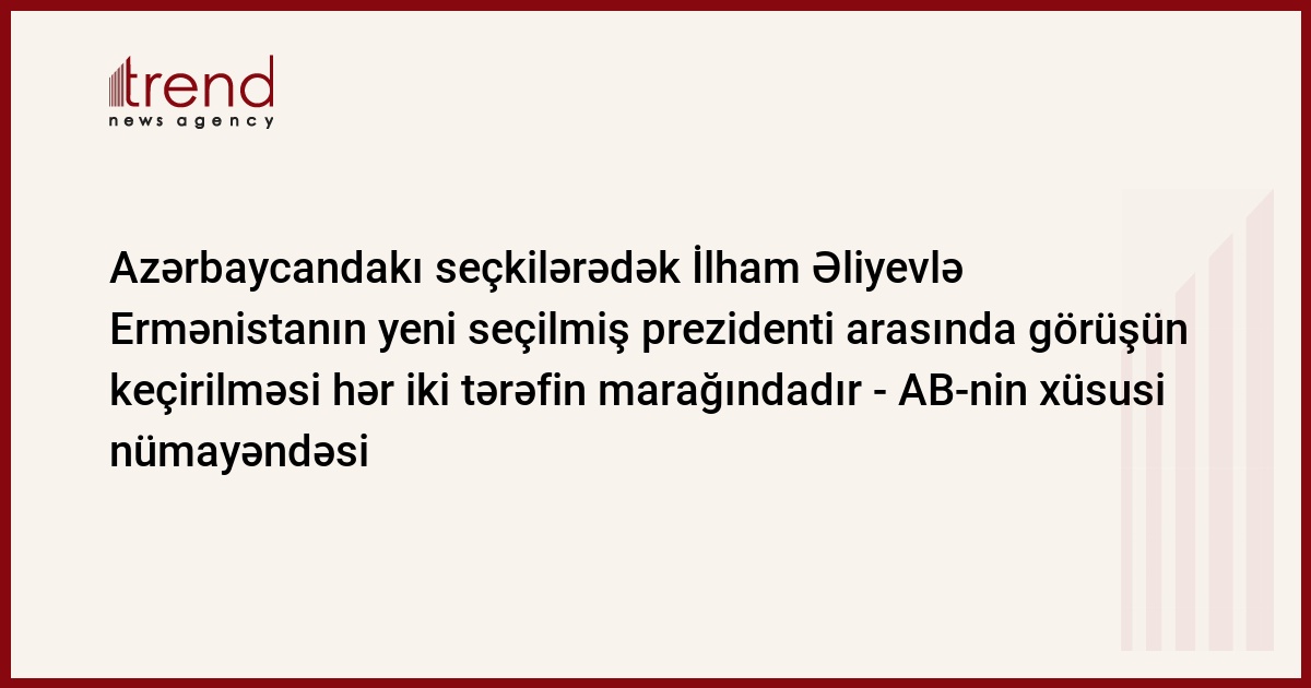 Fransa, Strasburq, 23 fevral / Trend müxbir A.Məhərrəmli/ "Hesab edirəm ki, Azərbaycandakı seçkilərədək prezident İlham Əliyevlə Ermənistanın yeni seçilmiş prezidenti arasında görüşün keçirilməsi hər iki tərəfin marağındadır. Axı onlar bir-birini tanımalıdır. Ümid edirəm ki, görüş baş tutacaq". Bunu Strasburqda jurnalistlərlə söhbətində Avropa Birliyinin Cənubi Qafqazdakı xüsusi nümayəndəsi Piter Semnebi deyib.