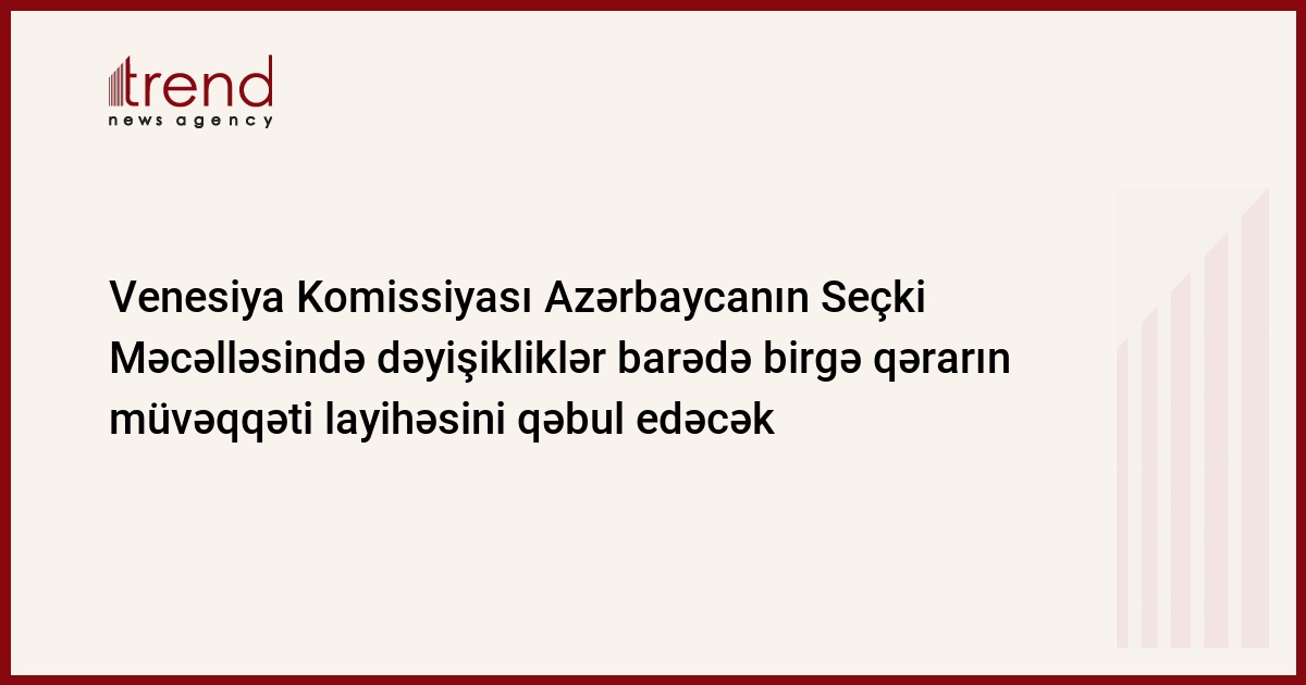 Azərbaycan, Bakı, 11 mart / Trend , müxbir K.Ramazanova/ Venesiya Komissiyası Azərbaycanın Seçki Məcəlləsində dəyişikliklər barədə birgə qərarın müvəqqəti layihəsini qəbul edəcək. Sənədə Komissiyanın martın 14-15-də İtaliyda keçiriləcək 74-cü plenar sessiyasında baxılacaq. Bu barədə Komissiyanın bazar ertəsi yayılan məlumatında bildirilir.