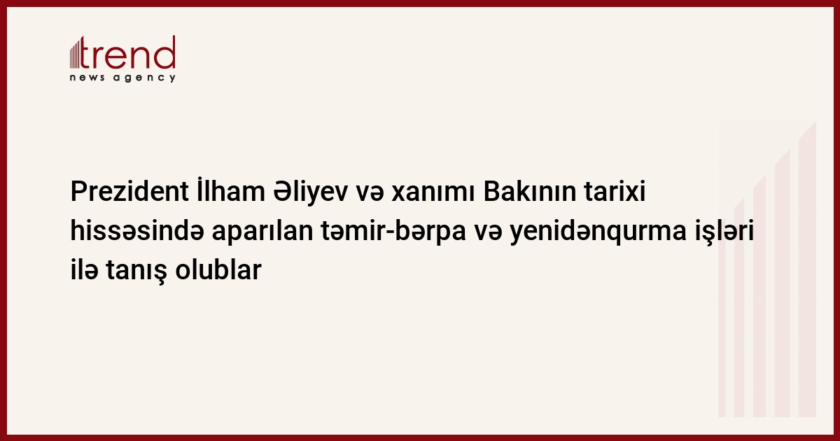 Azərbaycan, Bakı, 11 mart/ Trend Azərbaycan Prezidenti İlham Əliyev və Heydər Əliyev Fondunun prezidenti Mehriban Əliyeva çərşənbə axşamı Bakının tarixi hissəsində aparılan təmir-bərpa və yenidənqurma işləri ilə tanış olublar. Nazirlər Kabineti yanında "İçərişəhər" Dövlət Tarix-Memarlıq Qoruğu İdarəsinin rəisi Kamran İmanov prezident Əliyevə qədim İçərişəhərdə və ətraf ərazilərdə görülən işlər barədə ətraflı məlumat verib.