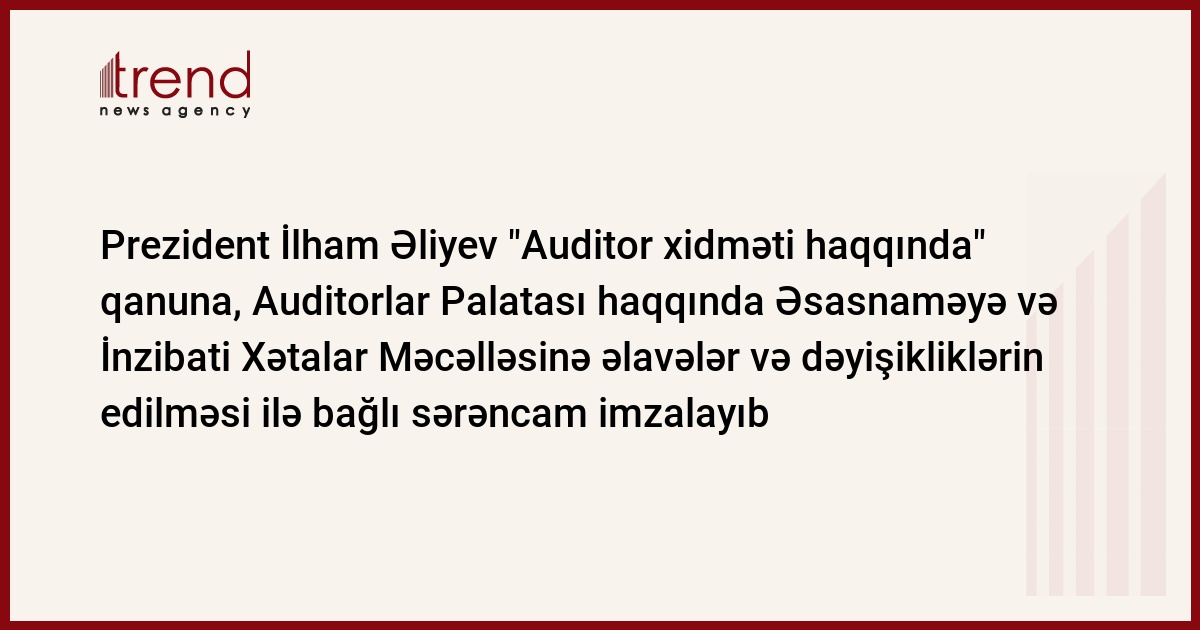 Prezident İlham Əliyev "Auditor xidməti haqqında" qanuna, Milli Məclisinin 1995-ci il 19 sentyabr tarixli 1115 nömrəli qərarı ilə təsdiq edilmiş "Azərbaycan Respublikasının Auditorlar Palatası haqqında Əsasnamə"yə və Azərbaycan Respublikasının İnzibati Xətalar Məcəlləsinə əlavələr və dəyişiklik edilməsi barədə" qanunun qüvvəyə minməsi ilə əlaqədar həmin qanunun tətbiq edilməsi ilə bağlı sərəncam imzalayıb.