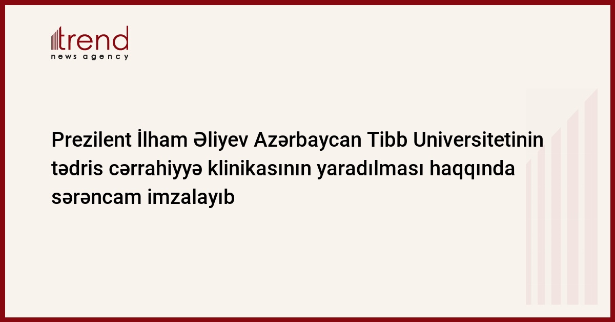 Azərbaycan, Bakı, 13 mart/ Trend /Prezilent İlham Əliyev cümə axşamıBakı şəhərində Azərbaycan Tibb Universitetinin tədris cərrahiyyə klinikasının yaradılması haqqında sərəncam imzalayıb. Sərəncama əsasən, klinikanın binasının inşasına başlamaq üçün 2008-ci il dövlət büdcəsində nəzərdə tutulmuş Prezidentin Ehtiyat Fondundan 1,0 (bir) milyon manat məbləğində vəsait ayrılıb.