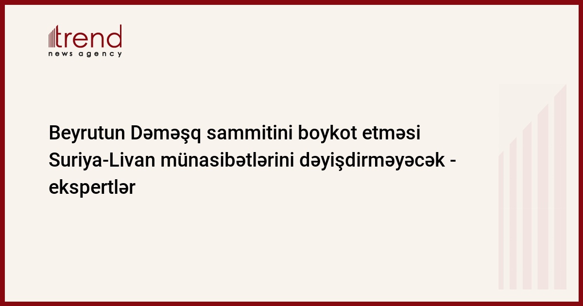 Azərbaycan, Bakı,29 mart / Trend , müxbir R.Hafizoğlu/ Livan hökumətinin Dəməşqdə keçirilən Ərəb Ölkələri Liqası sammitini boykot etməsi Suriya ilə onsuz da gərgin olan münasibətlərə dəyişiklik qətirməyəcək. "Dəməşqdə keçirilən Ərəb Ölkələri Liqası sammitinin boykot edilməsi Livan hökumətinin Suriyaya qarşı sərt siyasətində israrlı olduğunu gösrərir" - deyə Livanlı politoloq Rəhim Bayram Trend a bildirib.