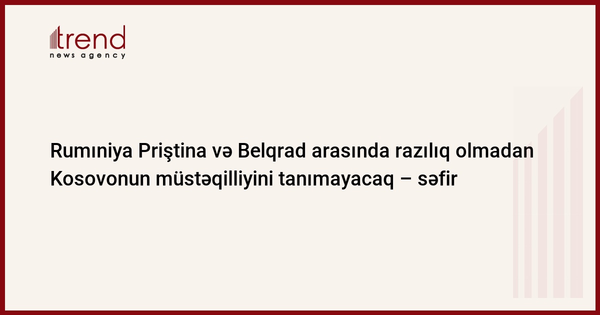 Azərbaycan, Bakı, 01 aprel/ Trend , müxbir K.Ramazanova/ Rumıniya Priştina və Belqrad arasında razılıq və BMT Təhlükəsizlik Şurasının Qətnaməsi olmadan Kosovonun müstəqilliyini tanımayacaq. Bu barədə çərşənbə axşamı Rumıniyanın Azərbaycandakı səfiri Nikolae Ureke mətbuat konfransında məlumat verib.