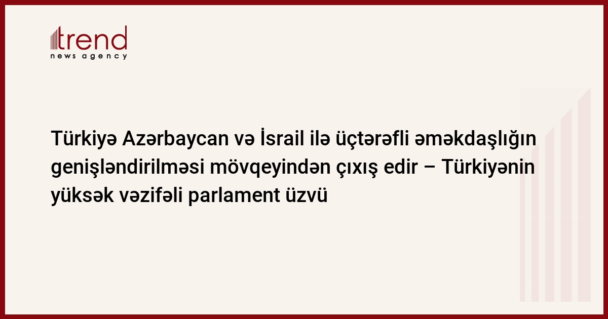 İsrail, Qüds, 09 aprel / Trend R.Abdullayev/ Türkiyə, Azərbaycan və İsrail aralarında mövcud olan əğəkdaşlıq və münasibətləri üçtərəfli əsaslar üzərində genişləndirməli və inkişaf etdirməlidir. Bu barədə Türkiyə parlamentinin beynəlxalq münasibətlər üzrə komissiyasının sədri Murad Mərcan bildirib.