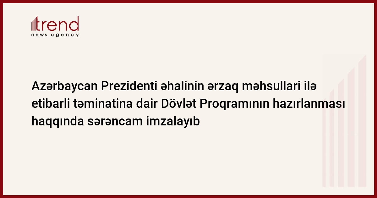 Azərbaycan, Bakı, 01 may/ Trend / Prezident İlham Əliyev cümə axşamı əhalinin ərzaq məhsullari ilə etibarli təminatina dair Dövlət Proqramının hazırlanması haqqında sərəncam imzalayıb. Nazirlər Kabineti Proqramın layihəsini üç ay müddətində hazırlayıb Prezidentə təqdim edəcək. Dövlət Proqramının layihəsinin hazırlanmasına müvafiq icra hakimiyyəti və digər dövlət orqanlarının, elmi təşkilatların, qeyri-hökumət və ictimai təşkilatların nümayəndələrini və müstəqil ekspertləri cəlb ediləcək. Sərəncam imzalandığı gündən qüvvədədir.