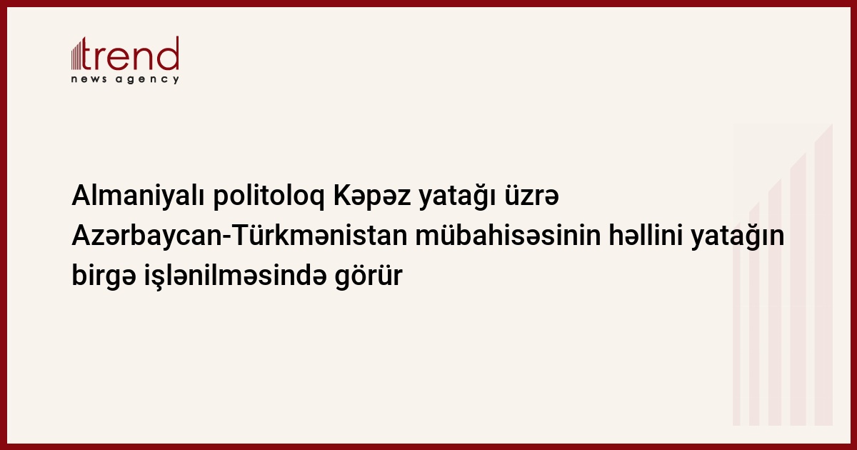Azərbaycan, Bakı, 23 may/ Trend , müxbir S.Ağayeva/ Almaniyalı politoloq Kəpəz yatağının kimə məxsus olması məsələsi üzrə Azərbaycan-Türkmənistan mübahisəsinin həllini yatağın birgə işlənilməsində görür.