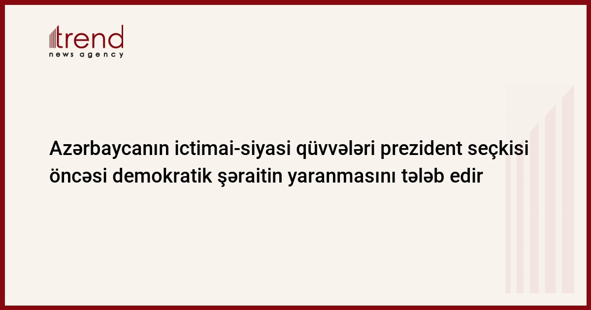 Azərbaycan, Bakı, 29 may / Trend , müxbir C.Babayeva/ Özünü Azərbaycanın demokratik qüvvələri hesab edən 20-dən çox siyasi partiya, QHT, politoloqlar prezident seçkisi öncəsi ölkədə demokratik şəraitin yaradılmasını tələb edir. Bu barədə onların cümə axşamı qəbul etdikləri birgə bəyanatda bildirilir.