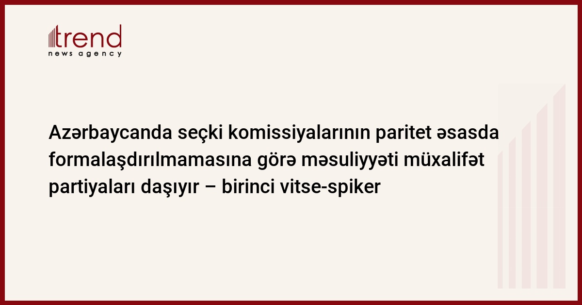 Azərbaycan, Bakı, 02 iyun/ Trend , müxbir İ.Əlizadə/ Azərbaycan parlamentinin birinci vitse-spikeri hesab edir ki, seçki komissiyalarının hakimiyyət və müxalifət nümayəndələrinin iştirakı ilə paritet əsasda formalaşdırılmamasına görə məsuliyyəti müxalifət partiyaları daşıyır. "Müxalifət 2000-ci ildə Mərkəzi Seçki Komissiyasının iclaslarını boykot etməklə seçki komissiyalarının paritet əsasda formalaşdırılmasında maraqlı olmadığını göstərdi", - deyə parlamentin bazar ertəsi keçirilən iclasında birinci vitse-spiker Ziyafət Əsgərov bildirib.