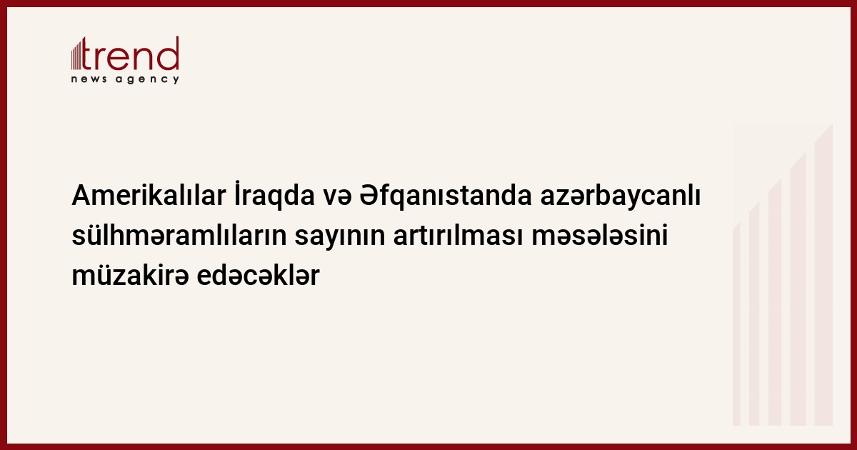 Azərbaycan, Bakı, 05 iyun / Trend , müxbir M.Əliyev/ İraqda və Əfqanıstanda azərbaycanlı sülhməramlıların sayının artırılması məsələsi Bakıda keçiriləcək növbəti Azərbaycan-Amerika hərbi məsləhətləşmələri zamanı müzakirə oluna bilər. Bu haqda ABŞ-ın Azərbaycandakı səfirliyinin birinci katibi Conatan Henik cümə axşamı Trend -a bildirib.