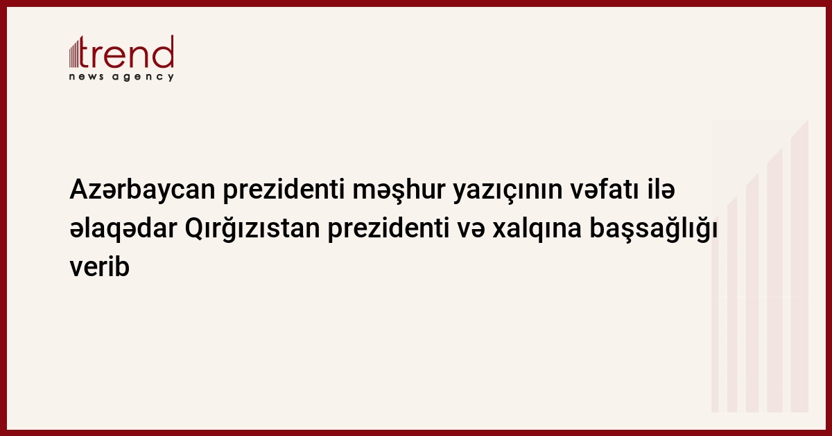 Azərbaycan, Bakı, 11 iyun/ Trend , müxbir S.Ağayeva/Azərbaycan prezidenti məşhur yazıçı Çingiz Aytmatovun vəfatı ilə əlaqədar Qırğızıstan prezidenti və xalqına başsağlığı verib.