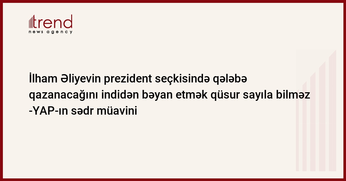 Azərbaycan, Bakı, 17 iyun/ Trend , müxbir E.Babayev/ Hakim Yeni Azərbaycan Partiyası (YAP) hesab edir ki, indiki dövlət başçısı İlham Əliyevin qarşıdan gələn prezident seçkilərində qələbə qazanacağını indidən bəyan etmək qüsur sayıla bilməz. "İlham Əliyevin xalq tərəfindən dəstəklənməsi prezident seçkisinin hansı nəticələrə gətirib çıxaracağı barədə fikir söyləməyimizə ciddi əsaslar yaradır. Bu qəbahət deyil və indiki reallıqlar çərçivəsində Azərbaycana lazım olan vacib bir üstünlükdür", çərşənbə axşamı Trend -a müsahibəsində YAP sədrinin müavini və icra katibi Əli Əhmədov deyib.