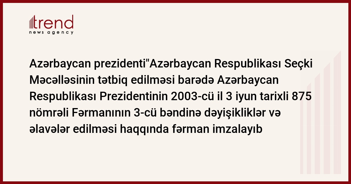 "Azərbaycan Respublikası Seçki Məcəlləsinin tətbiq edilməsi barədə Azərbaycan Respublikası Prezidentinin 2003-cü il 3 iyun tarixli 875 nömrəli Fərmanının (Azərbaycan Respublikasının Qanunvericilik Toplusu, 2003-cü il, №6, maddə 281) 3-cü bəndinə dəyişikliklər və əlavələr edilməsi haqqında fərman imzalayıb. Fərmana əsasən, doqquzuncu abzasdan "46.4-cü," sözləri çıxarılır və həmin abzasın sonunda nöqtə işarəsi nöqtəli vergül işarəsi ilə əvəz edilir. Bundan başqa bəndə aşağıdakı məzmunda onuncu abzas əlavə edilir: "həmin Məcəllənin 46.4-cü maddəsinin birinci cümləsində nəzərdə tutulmuş "müvafiq icra hakimiyyəti orqanları"nın səlahiyyətlərini yerli icra hakimiyyəti orqanları Azərbaycan Respublikasının Daxili İşlər Nazirliyi və Azərbaycan Respublikasının Ədliyyə Nazirliyi ilə birlikdə həyata keçirirlər.". Fərman dərc edildiyi gündən qüvvəyə minir.