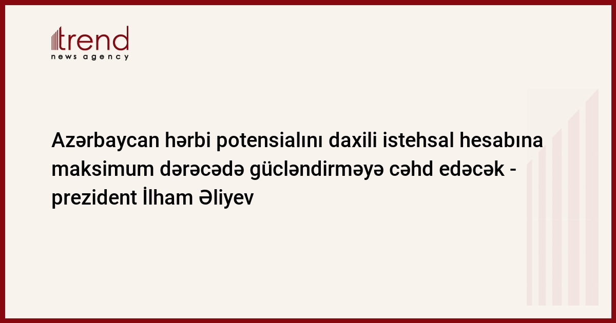 Dövlət başçısı qeyd edib ki, hazırda Azərbaycan hərbi məhsulları dost ölkələrdən alır, lakin öz hərbi potensialını daxil istehsal hesabına maksimum dərəcədə gücləndirməyə cəhd etməlidir. "Bunun üçün bütün imkanlar var və bu sahə üzrə xərclər hər il artırılacaq", - deyə prezident bildirib.