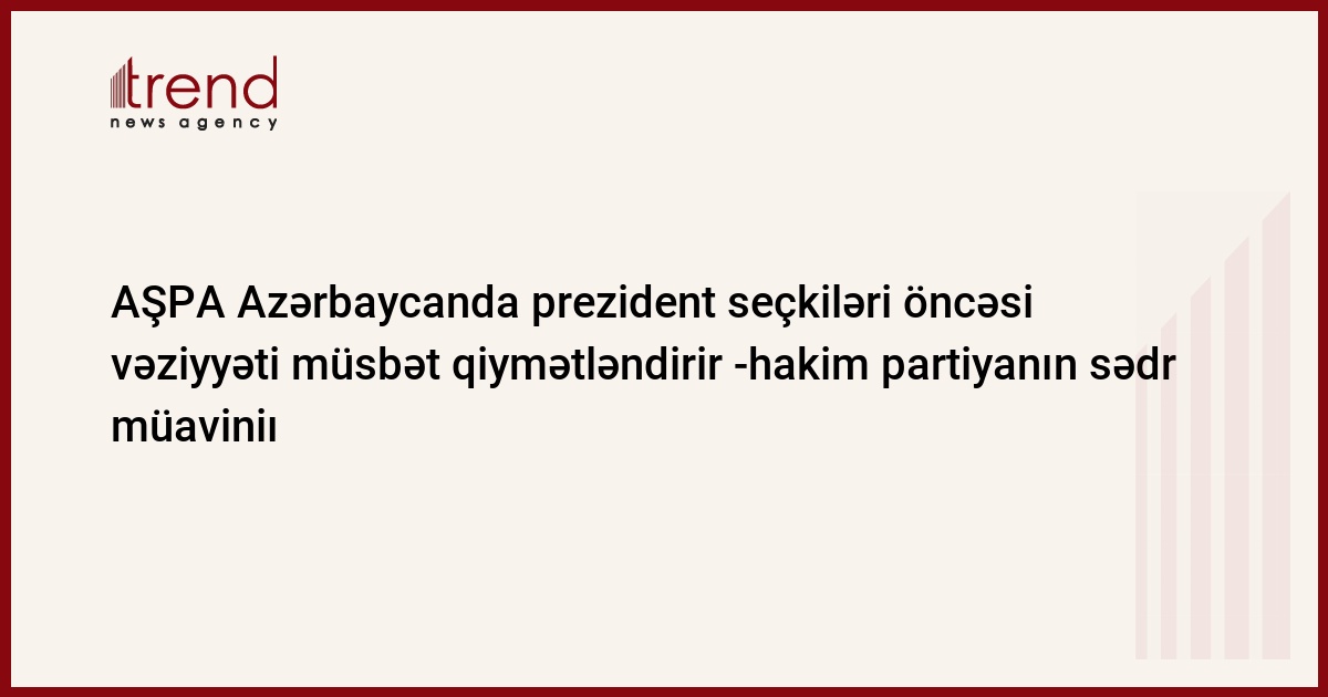 Azərbaycan, Bakı, 01 iyul / Trend , müxbir İ.Əlizadə/ Avropa Şurası Parlament Assambleyası (AŞPA) Azərbaycanda prezident seçkiləri öncəsi vəziyyəti və demokratik inkişafı müsbət qiymətləndirir. "AŞPA prezidenti Azərbaycanda demokratiya, insan haqları və mətbuat azadlığının təmin olunması sahəsində ciddi addımlar atıldığını və xeyli irəliləyiş əldə edildiyini açıq şəkildə bildirdi" - çərşənbə axşamı Trend -a Azərbaycanda səfərdə olan AŞPA prezidenti Luis Maria de Puçla görüşdən sonra hakim Yeni Azərbaycan Partiyası (YAP) icra katibinin müavini Əli Əhmədov bildirib.