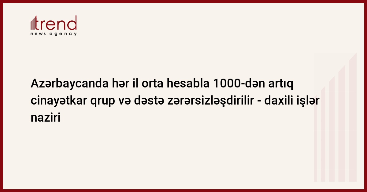 Azərbaycan, Bakı, 02 iyul / Trend , müxbir K.Zərbəliyeva/ Azərbaycanın daxili işlər naziri bəyan edib ki, ölkədə hər il orta hesabla 1000-dən artıq cinayətkar qrup və dəstə zərərsizləşdirilir.