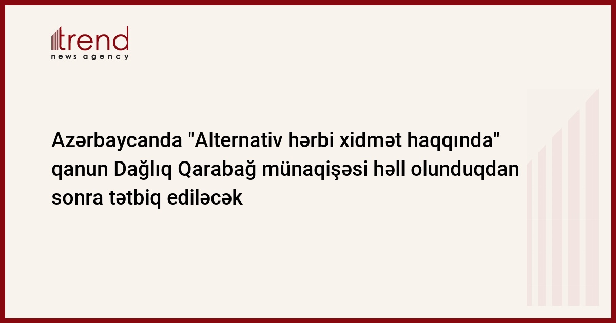 Azərbaycan, Bakı, 03 iyul/ Trend , müxbir E.Babayev / Azərbaycanda "Alternativ hərbi xidmət haqqında" qanun layihəsi Dağlıq Qarabağ münaqişəsi həll olunduqdan sonra tətbiq ediləcək.
