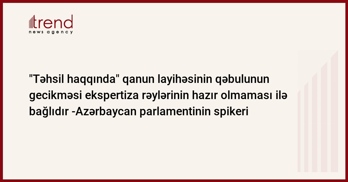 Azərbaycan, Bakı, 04 iyul/ Trend , müxbir İ.Əlizadə/ Azərbaycan parlamentinin spikeri cümə günü bəyan edib ki, ölkənin "Təhsil haqqında" qanun layihəsinin qəbulunun gecikməsi ekspertiza rəylərinin hazır olmaması ilə bağlıdır.