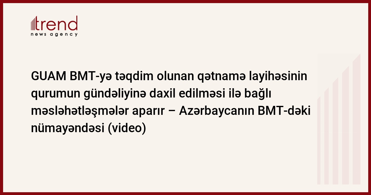 Azərbaycan, Bakı, 08 iyul / Trend , müxbir İ.Əlizadə/ BMT Baş Assambleyasında "dondurulmuş münaqişələr"ə dair müzakirələrin aparılması üçün "Demokratiya və İqtisadi İnkişaf Naminə Təşkilat-GUAM" ölkələri tərəfindən təqdim olunan qətnamə layihəsinin gündəliyə daxil edilməsi ilə bağlı məsləhətləşmələr aparılır.