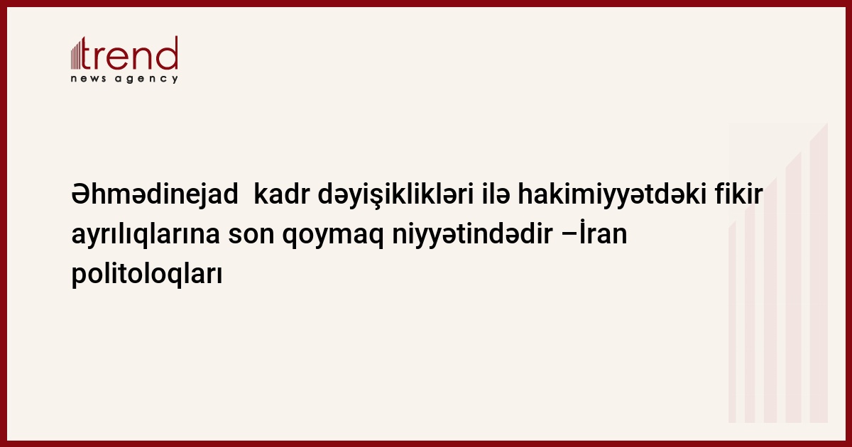 İran, Tehran, 31 iyul / " R.Azadbəxş , T.Cəfərov / İran prezidentinin hakim partiyanın dövləti tənqid edən qanadından iki nüməyəndəni nazir vəzifəsinə təqdim etməsi, hakim koalisiyanı birləşdirib, onun tam dəstəyini qazanmaq məqsədi daşıyır. "Əhmədinejad nazir vəzifələrinə təqdim etdiyi yeni namizədlərlə hakim koalisiyanı öz maraqları istiqamətində birləşdirmək istəyir" - deyə, Iran politoloqu Əhməd Rəzəvian Trend -a bildirib.