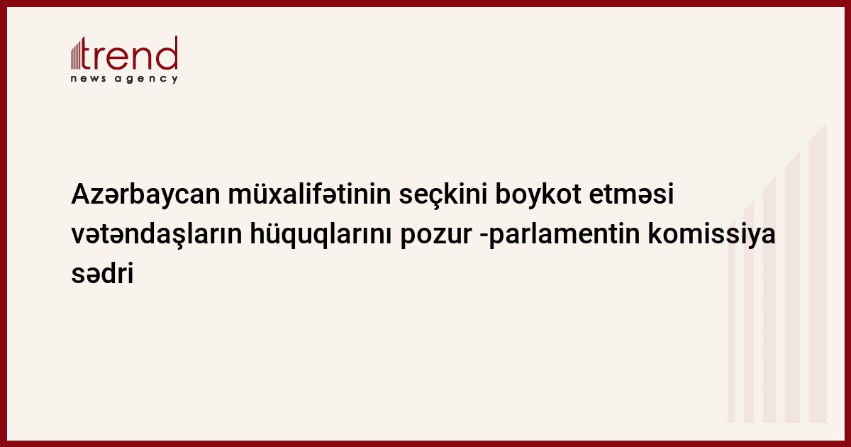 Azərbaycan, Bakı, 07 avqust / Trend , müxbir İ.Əlizadə/ Azərbaycan parlamentinin İnsan hüquqları komissiyasının sədri hesab edir ki, müxalifət partiyalarının prezident seçkisini boykot etməsi, bununla bağlı çağırışlar vətəndaşların Konstitusiyada əks olunan seçmək və seçilmək hüququnu pozur.