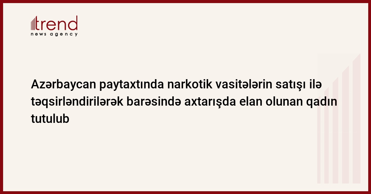 Azərbaycan, Bak?, 16 avqust / Trend , müxbir S.Kaz?ml?/ Azərbaycan paytaxtında narkotik vasitələrin satışında təqsirləndirilərək barəsində axtarış elan olunan 58 yaşlı qadın ölkədən çıxmaq istəyərkən tutulub.