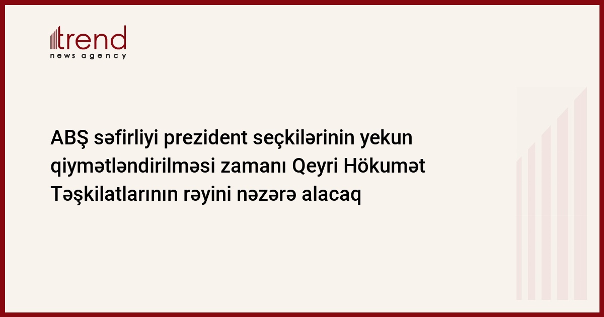 Azərbaycan, Bakı, 21 avqust / Trend , müxbir C.Babayeva/ ABŞ -ın Azərbaycandakı səfirliyi oktyabrın 15 -də keçiriləcək prezident seçkiləri zamanı müşahidə prosesində fəal iştirak edəcək.