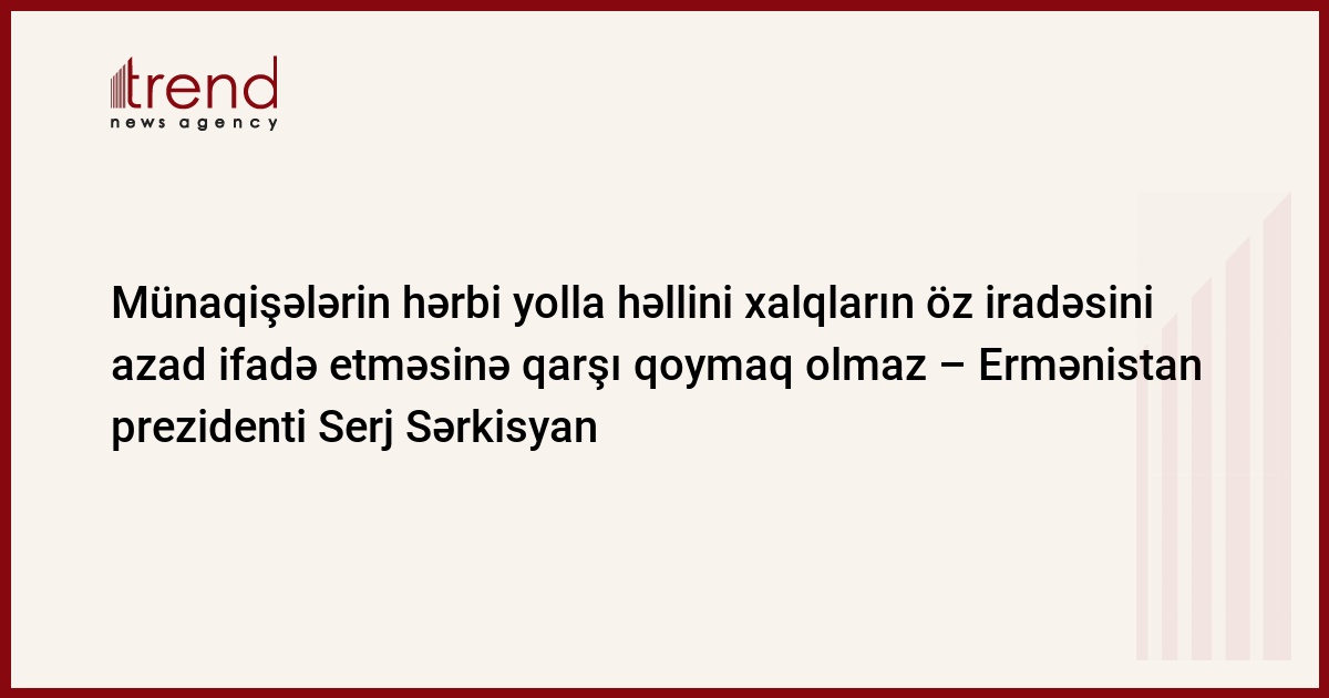 Azərbaycan, Bakı, 05 sentyabr/ Trend müxbir E.Tariverdiyeva/ Münaqişələrin hərbi yolla həllini xalqların öz iradəsini azad ifadə etməsinə qarşı qoymaq olmaz, bu ağır nəticələrə səbəb ola bilər,- Ermənistan prezidenti Serj Sərkisyan cümə günü Moskvada keçirilən brifinqdə bildirib. Brifinq Kollektiv Təhlükəsizlik Müqaviləsi Təşkilatının (KTMT) iclasından sonra keçirilib.