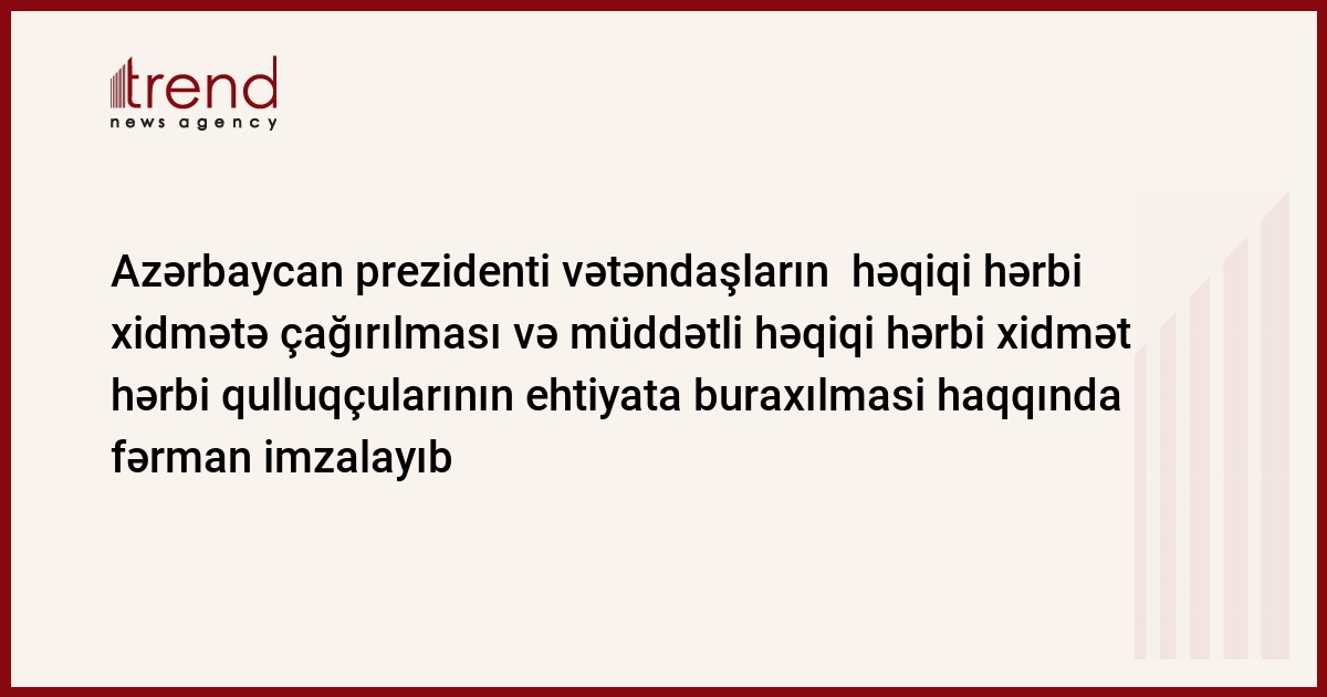 Azərbaycan, Bakı, 08 sentyabr / Trend / Azərbaycan prezidenti İlham Əliyev bazar ertəsi Azərbaycan Respublikası vətəndaşlarının 2008 - ci ilin oktyabrın 1- dən 30 - dək həqiqi hərbi xidmətə çağırılması və müddətli həqiqi hərbi xidmət hərbi qulluqçularının ehtiyata buraxılması haqqında fərman imzalayıb.