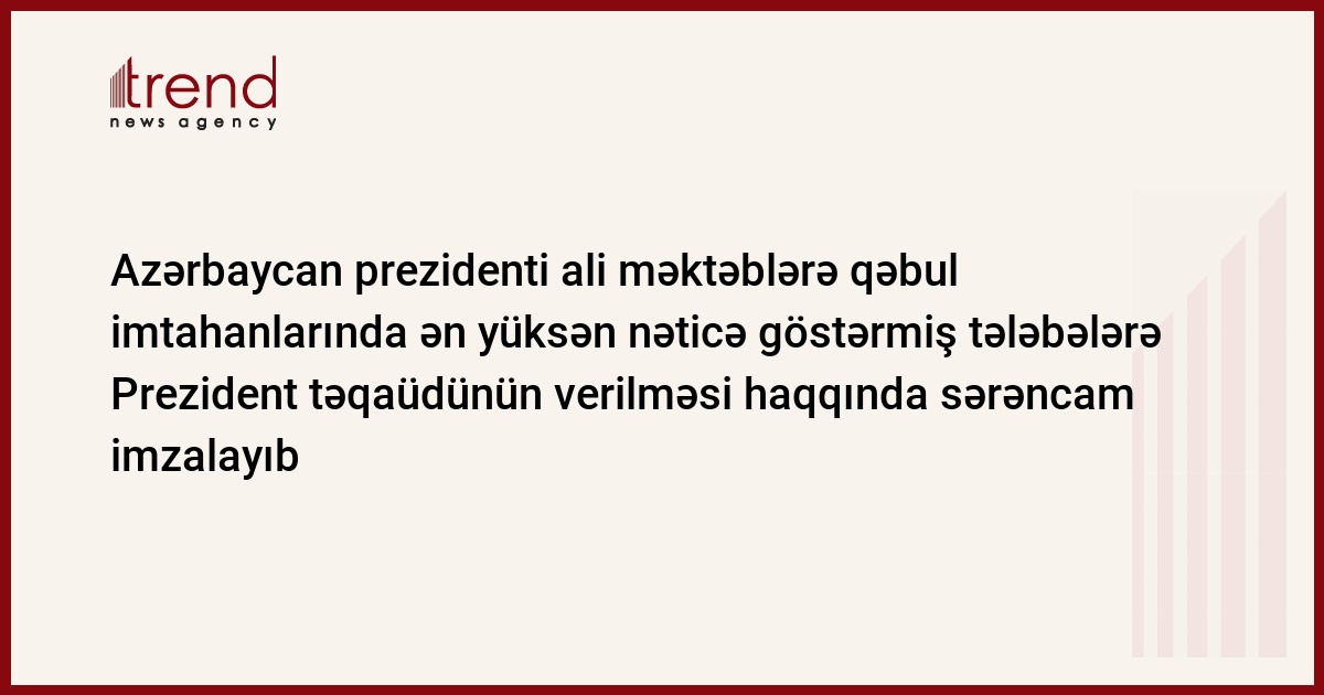 Azərbaycan, Bakı, 08 sentyabr / Trend / Azərbaycan prezidenti İlham Əliyev bazar ertəsi 2008/2009-cu tədris ilində Azərbaycanın ali məktəblərinə qəbul imtahanlarında ixtisas qrupları üzrə ən yüksək nəticə göstərmiş tələbələrə Prezident təqaüdünün verilməsi haqqında sərəncam imzalayıb.