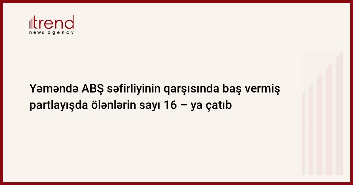 Yəmənin Paytaxftı Sənada bü gün səhər saatlarında ABŞ səfirliyinin qarşısında baş vermiş partlayışda ölənlərin sayı 16 nəfərə çatıb. Bu barədə Qətərin Əl - Cəzirə telekanalı məlumat verib.