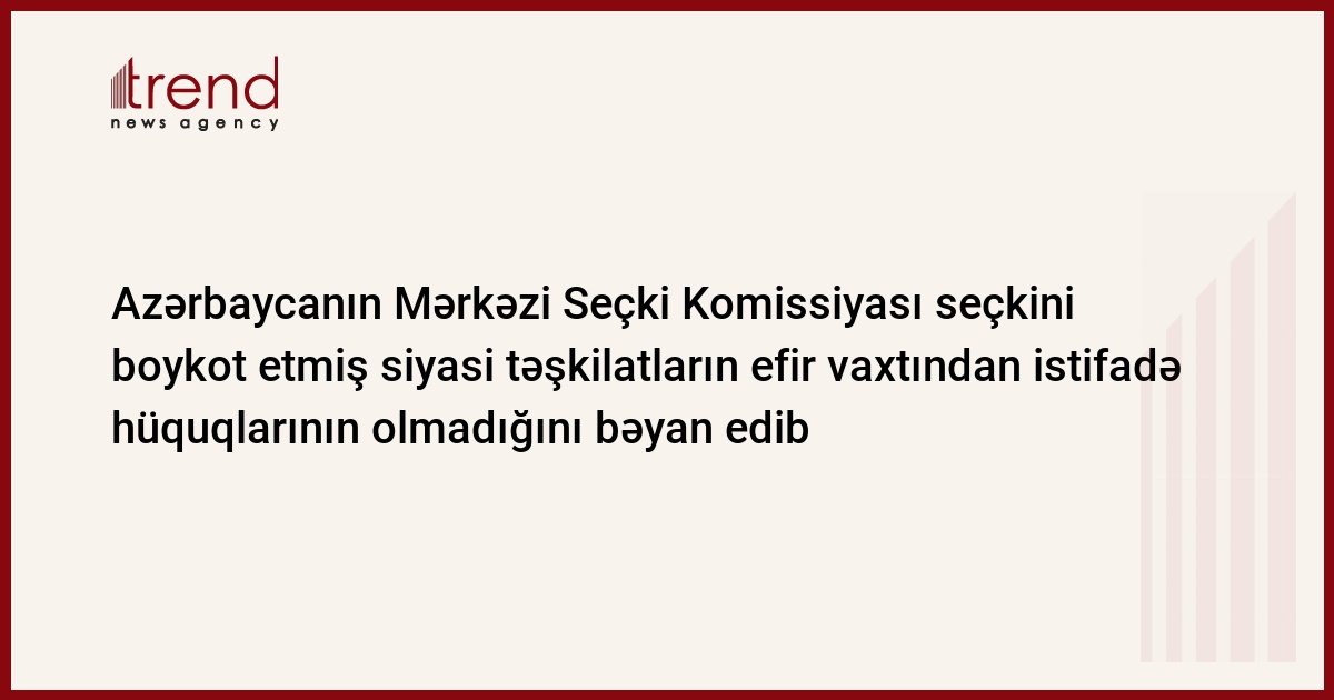 Azərbaycanın Mərkəzi Seçki Komissiyasının (MSK) mətbuat xidmətinin rəhbəri Azər Sarıyev isə, Trend -a bildirib ki, prezident seçkisində iştirak etməyən qurumların, o cümlədən siyasi təşkilatlar və onların səlahiyyətli nümayəndələrin həm ödənişli, həm də ödənişsiz efir vaxtından istifadə etmək hüquqları yoxdur.