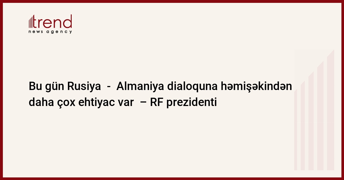 Azərbaycan, Bakı, 02 oktyabr/ Trend , müxbir V.Javoronkova / Bu gün Rusiya - Almaniya dialoquna daha çox ehtiyac var. "Vesti" telekanalının verdiyi xəbərə görə, bu barədə Rusiya Federasiyasının prezidenti Dmitri Medvedyev "Peterburq dialoqu" səkkizinci rus - alman forumunda çıxış edərkən bildirib.