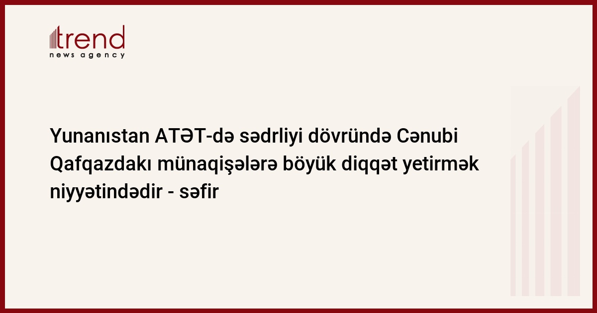 Azərbaycan, Bakı, 03 oktyabr / Trend , müxbir N.Abdullayeva/ Yunanıstan 2009-cu ildə ATƏT-də sədrliyi dövründə Cənubi Qafqazdakı münaqişələrə böyük diqqət yetirmək niyyətindədir, - Yunanıstanın Azərbaycana yenidən təyin olunmuş səfiri Eoanis Metaksas Azərbaycanın xarici siyasət idarəsinin rəhbəri Elmar Məmmədyarovla görüşdə deyib.