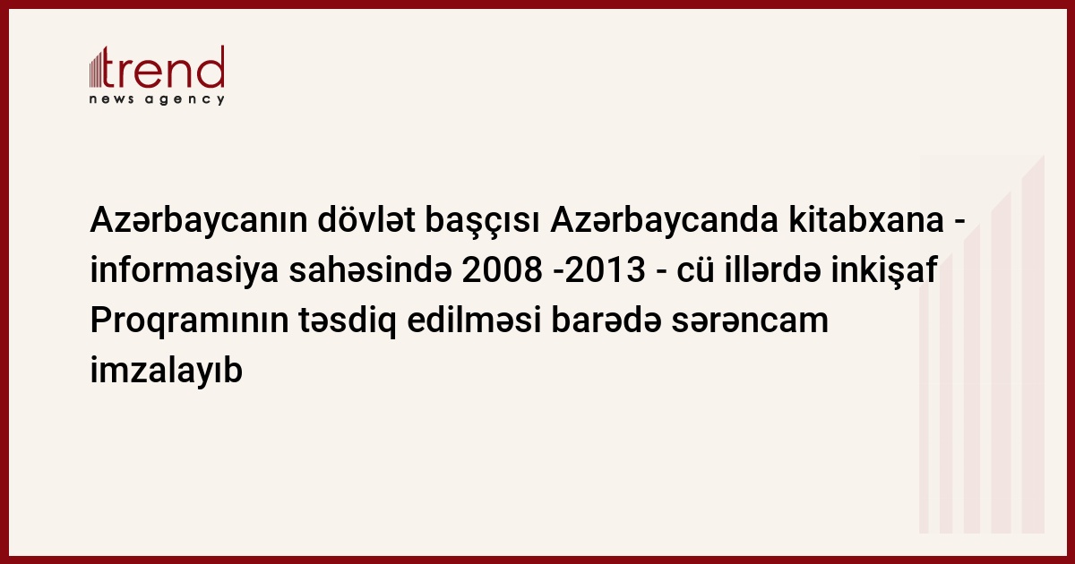 Azərbaycan, Bakı, 06 oktyabr / Trend , / Azərbaycan dövlət başçısı Azərbaycan respublikasinda kitabxana-informasiya sahəsinin 2008 -2013 - cü illərdə inkişafi üzrə Dövlət Proqramiїnin təsdiq edilməsi barədə sərəncam imzalayıb.